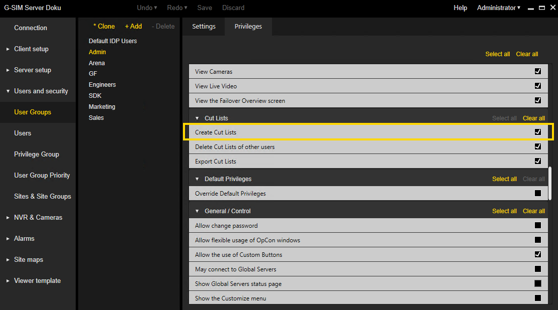 These privileges can be enabled for individual users or user groups:
