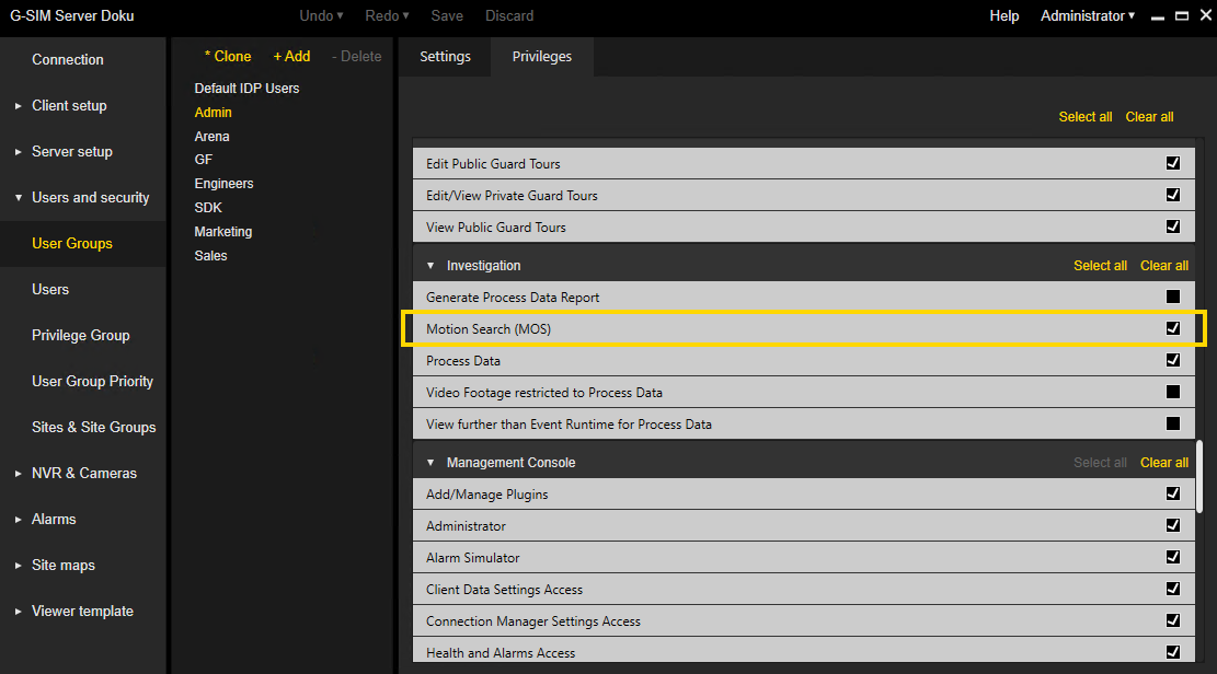 Before using MOS in G-SIM, make sure the following privileges are enabled in Management Console: